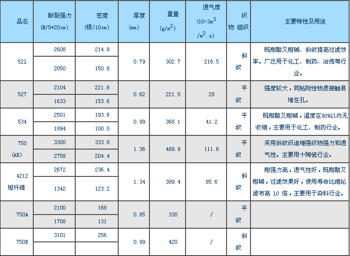 产品型号:丙纶短纤滤布:4212 丙纶长纤布:52l、527、534、750(AB)、750(A)、750(B)、522、108(B)、108(C)、850。