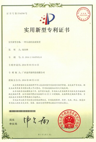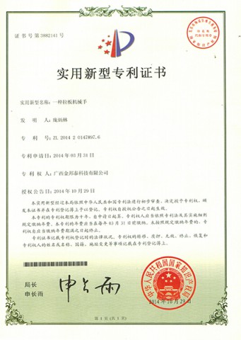 2014年3月31日,广西金邦泰科技有限公司收到由国家知识产权局下发的新一批专利申请受理通知书,分别为实用新型专利:一种拉板机械手,及实用新型专利:一种压滤机接液装置。