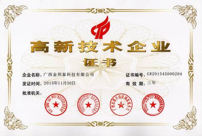 广西金邦泰科技有限公司于2015年12月被认定为国家高新技术企业,并于近日获得由广西壮族自治区科学技术厅、财政厅、国家税务局、地方税务局联合颁发的国家《高新技术企业证书》。