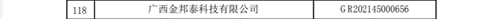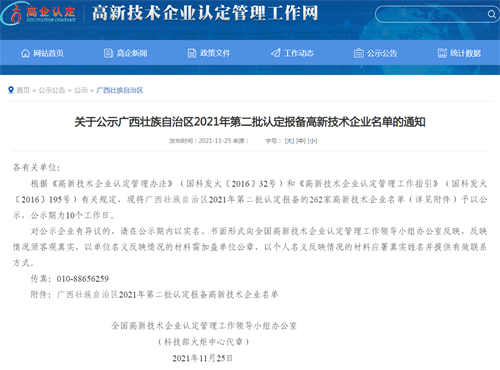 2021年11月25日,广西壮族自治区2021年认定的第二批高新技术企业备案名单对外公示,广西金邦泰科技有限公司名列其中。
