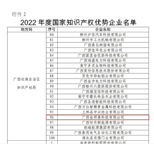 近日,国家知识产权局按照《国家知识产权局办公室关于面向企业开展2022年度知识产权强国建设示范工作的通知》(国知办函运字〔2022〕497号)要求,经企业测评、推荐上报、审核确认等程序,公示了482家企业为国家知识产权示范企业、2513家企业为国家知识产权优势企业。广西金邦泰科技有限公司公司凭借领先的研发创新和知识产权管理实力,荣获2022年度“国家级知识产权优势企业”称号。